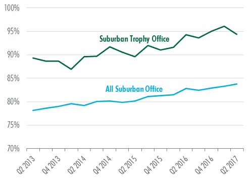 | The market for trophy office space in the suburbs, near its highest occupancy levels tracked, had a tough quarter, though. Over 114,000 of negative absorption occurred, dropping the occupancy rate for suburban trophy offices slightly to 94.4%. Over the last year, demand has essentially been flat. Nonetheless, asking rents in Q2 2017 reached their highest levels ($35.07 per sq. ft.) this cycle, and occupancy continues to trend upwards. |