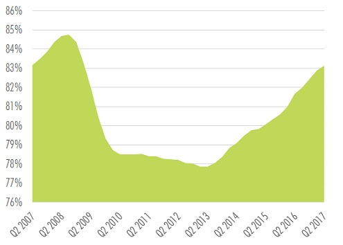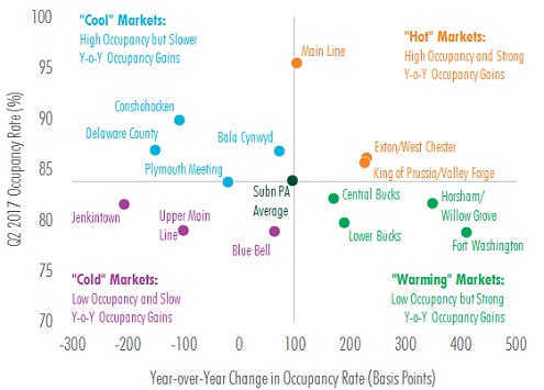 On the more positive side, the Main Line continues to be extremely tight for space options, and the bellwether submarket of King of Prussia/Valley Forge has seen occupancy rise for seven consecutive quarters. Meanwhile, the Exton/West Chester submarket has realized a drop in its vacancy rate of 23.8% three years ago to 13.9% in Q2 2017.