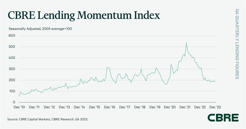 The CBRE Lending Momentum Index, which tracks the pace of CBRE-originated commercial loan closings in the U.S., increased by 1.0% from Q3 2023—marking the first quarterly increase since Q1 2022. The index still saw a decline of 38.1% compared to the strong loan volume of Q4 2022. The index closed Q4 2023 at a value of 189.