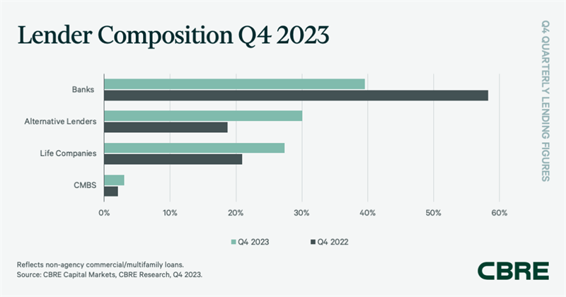 Life insurance companies accounted for 27.4% of origination volume in Q4 2023, down from 33% in the previous quarter, predominantly in fixed-rate acquisition and refinancing loans for industrial and retail assets.