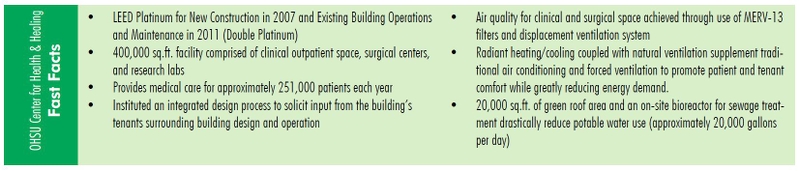 There are several benefits and results noted within the OHSU Fast Facts related to the design and systems that reflect the dedication to sustainability within a wellness environment. However, within this innovative approach are noted challenges that required strategic solutions to achieve the desired cost savings and operational functionality while balancing the desire to achieve high occupant and patient satisfaction.